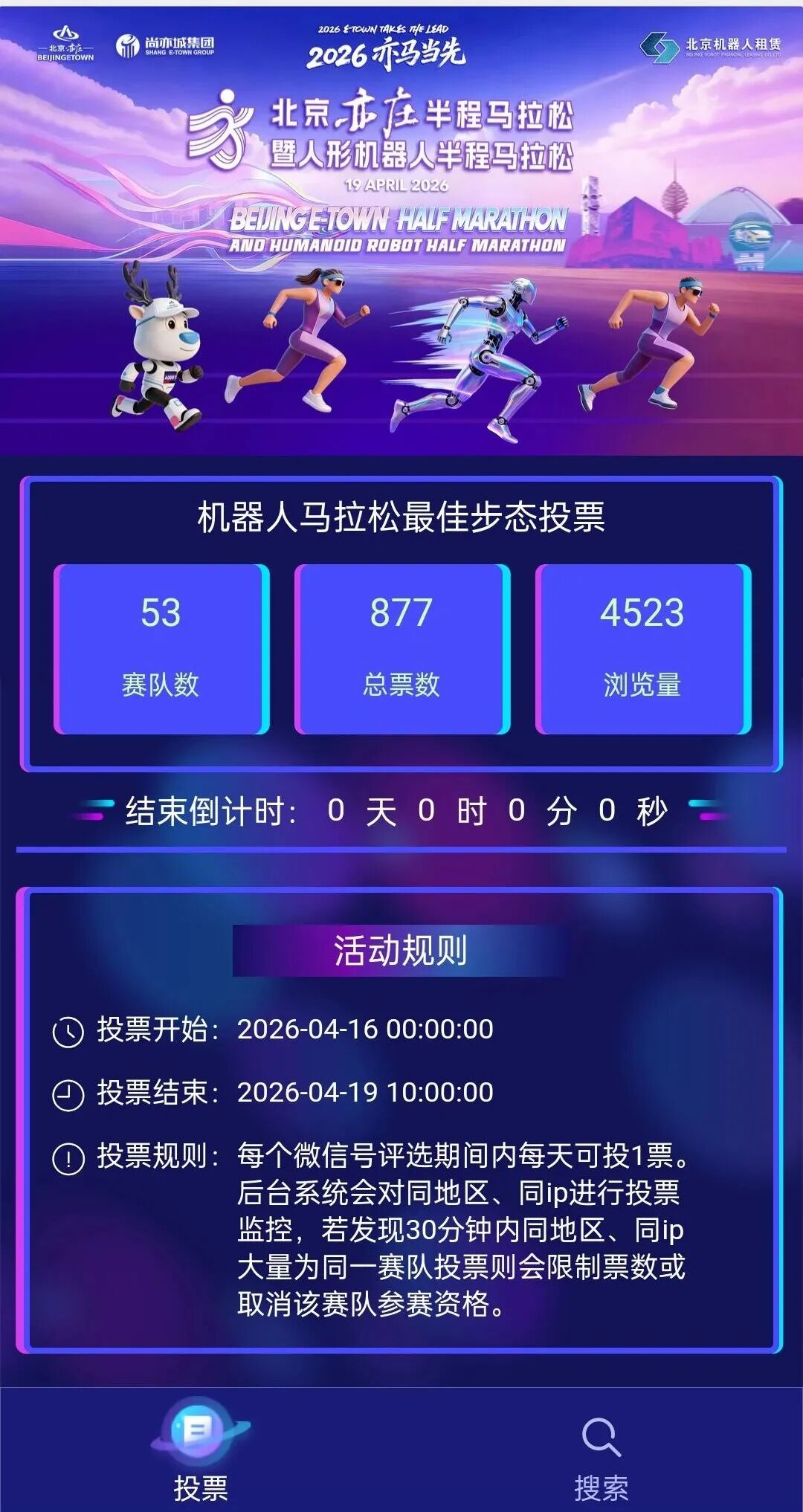 4月16日零时,机器人马拉松最佳步态投票通道在“亦竞派”赛事官网正式上线。该奖项旨在票选出跑步姿态最迷人、最拟人的参赛机器人队伍,将技术突破与公众审美深度融合,成为本届赛事最具互动性的看点之一。