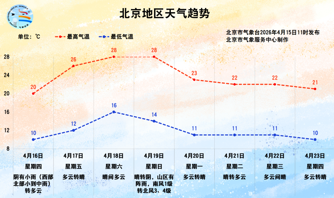 根据北京市气象台消息,明天(16日)有小雨天气,西部、北部小到中雨,外出请携带雨具并注意交通安全。受降雨影响,气温也有所下降,白天最高气温20℃,请适时调整衣物。