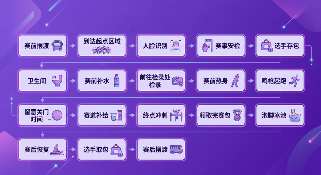 所有参赛人员须身着适宜的运动服装,确保号码布清晰外露;严禁穿着遮挡身份(如面具、头盔)、带有尖锐硬质或易脱落配件、拖地易缠绕、体积过大占道或需停留表演的造型,以及过度暴露、低俗怪异、涉及政治、宗教或歧视攻击等内容的奇装异服通过人脸识别进入安检区。