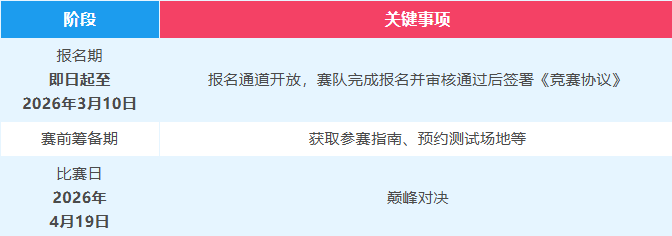 这是为先行者准备的赛场,是智能体迈向复杂现实世界的第一步。 这里没有标准答案,只有不断刷新的极限。2026年4月19日,我们期待与您一起,在北京亦庄,将代码与算法,转化为迈向终点线的坚实足迹。
